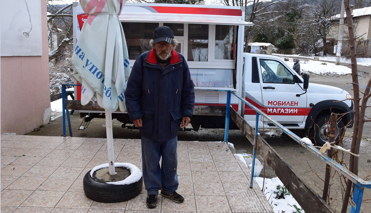 „Отскоро живея тук. Мобилният магазин КООП много ни улеснява, защото преди ходех веднъж в месеца в София и мъкнех торби с храна оттам“, казва ми с усмивка видимо интелигентна жена с черно яке. Иван наистина си купува три вафли и моли да го снимам пред мобилния магазин. Той чака с нетърпение идването на буса всеки понеделник и четвъртък, за да си вземе от любимите вафли и да намери с някого да поприказва. „Живея в първата къща, имам коне, крави, кокошки, пуйки – като зоологическа градина е“. Шегувам се с него, че затова не купува яйца и месо, с каквито пълнят чантите повечето му съселяни. След като са си напазарували, те не бързат да се прибират, а сядат в покритата беседка до църквата. Така пътуващият магазин се оказва не само улеснение, но и най-честият повод за приятна раздумка с приятели и комшии.