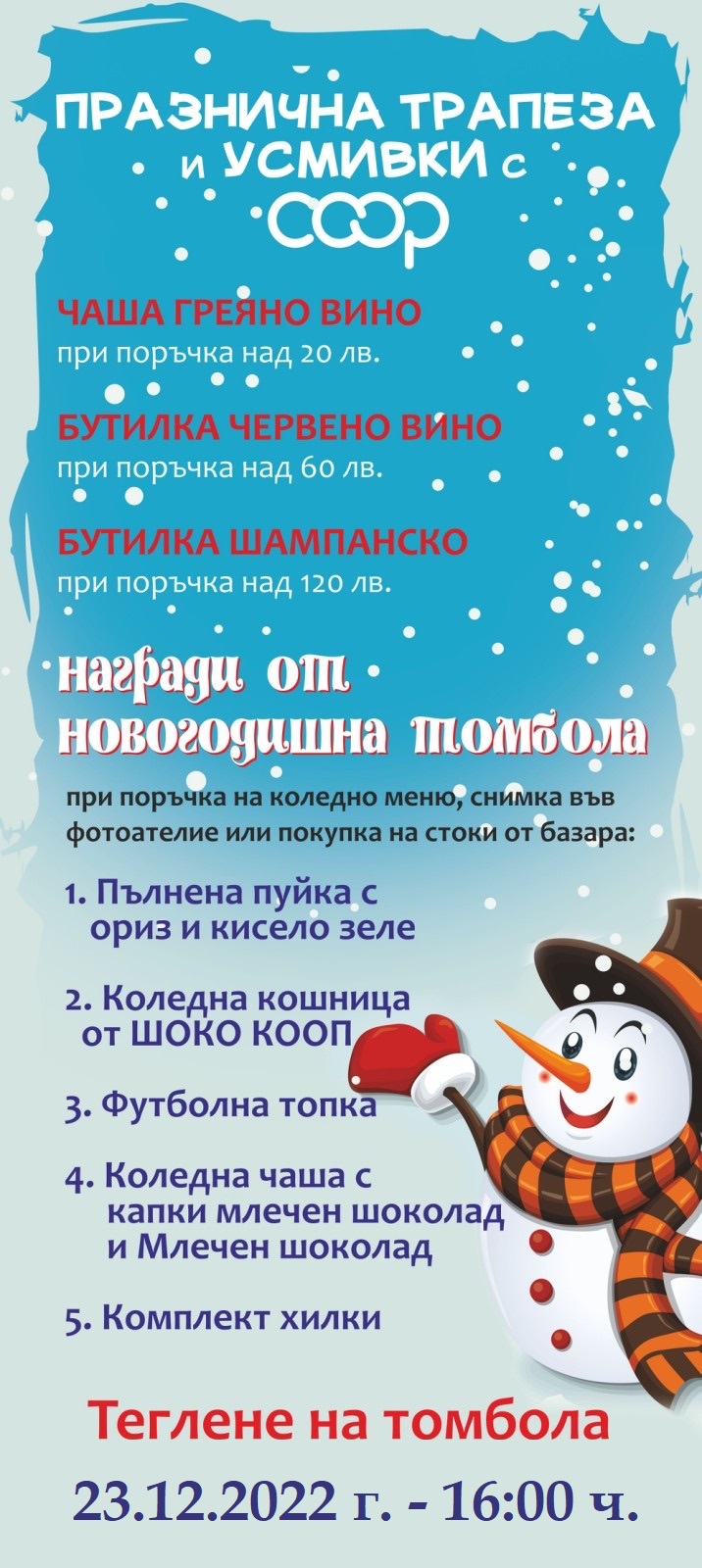 От 14 до 23 декември в КООП зоната на улица „Г. С. Раковски“ №99 Ви очаква изобилие от ръчно изработени шоколад и бонбони, специална селекция български и сицилиански вина, атрактивни предложения за коледната трапеза.